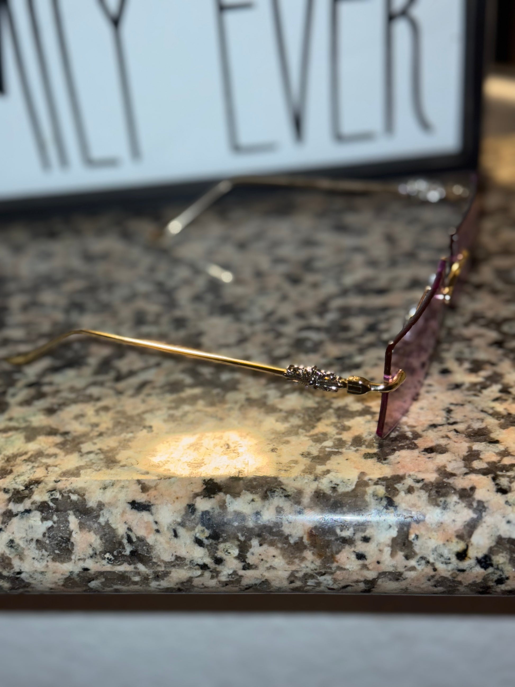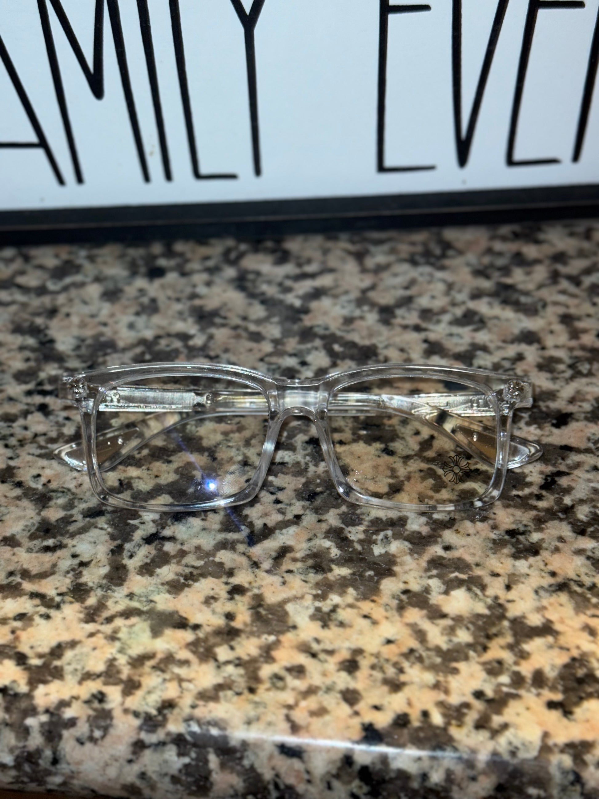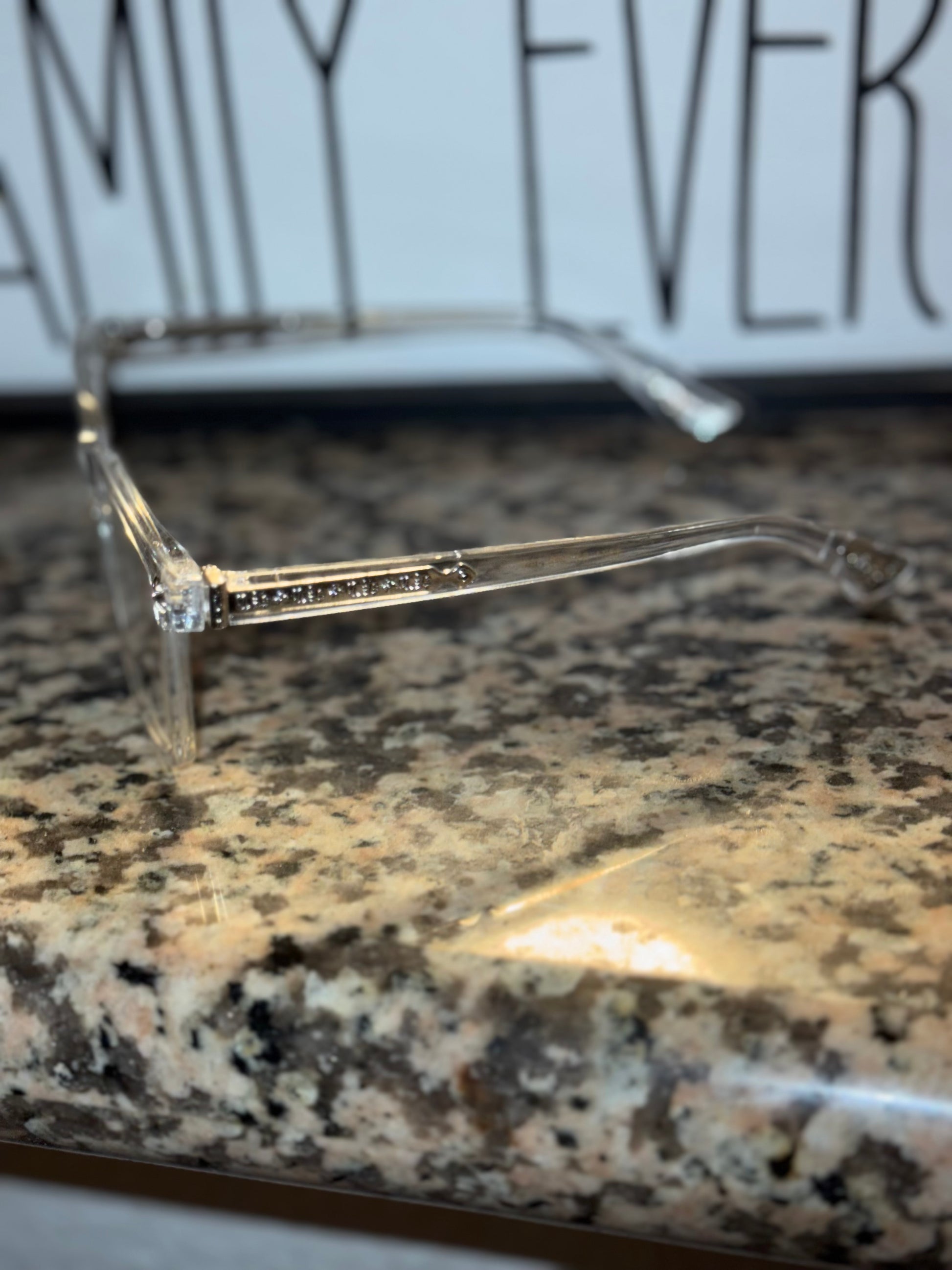 A pair of stylish, high-quality glasses that combine a classic design with modern flair. They feature a sleek, rectangular frame with subtle metallic detailing on the temples, adding a touch of edgy sophistication. The durable construction is built for long-lasting wear, making these glasses perfect for a statement look, whether you're at the office or out on the town.